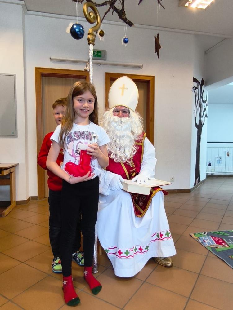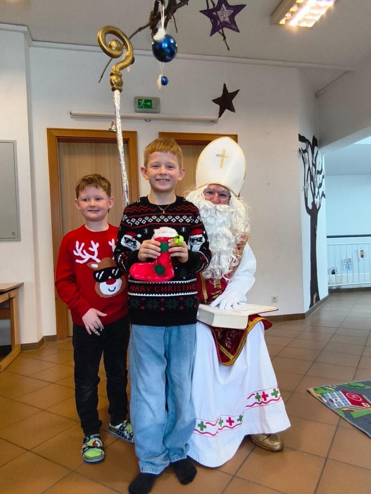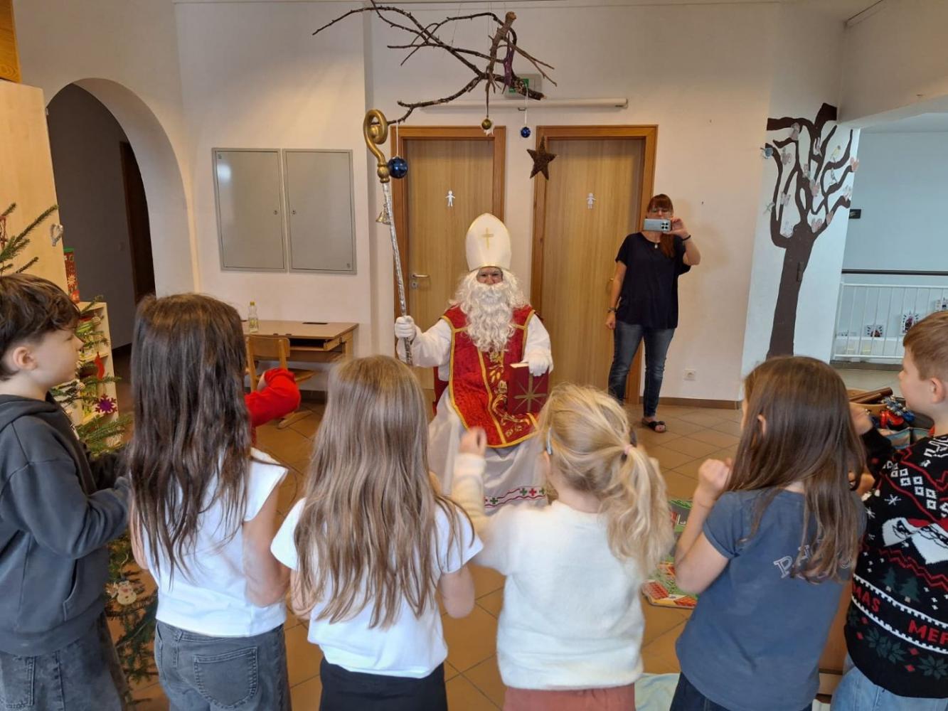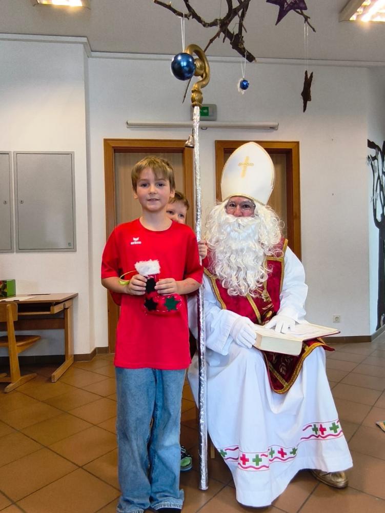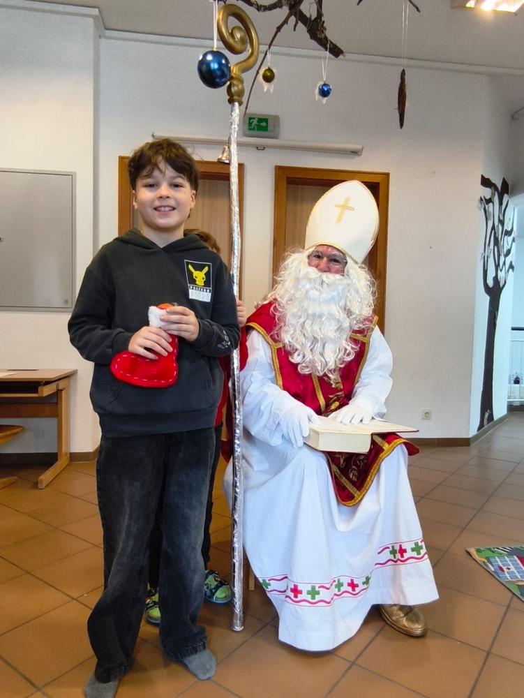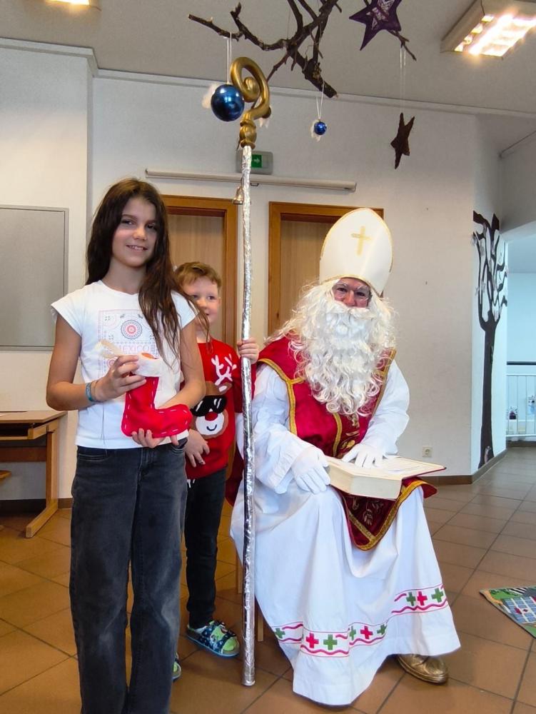 Am Freitag, den 05.12.2025, besuchte uns der Heilige Nikolaus in der Schule. Zusammen mit dem Kindergarten sangen wir für den Nikolaus Lieder und sagten ihm unsere gelernten Gedichte auf.
