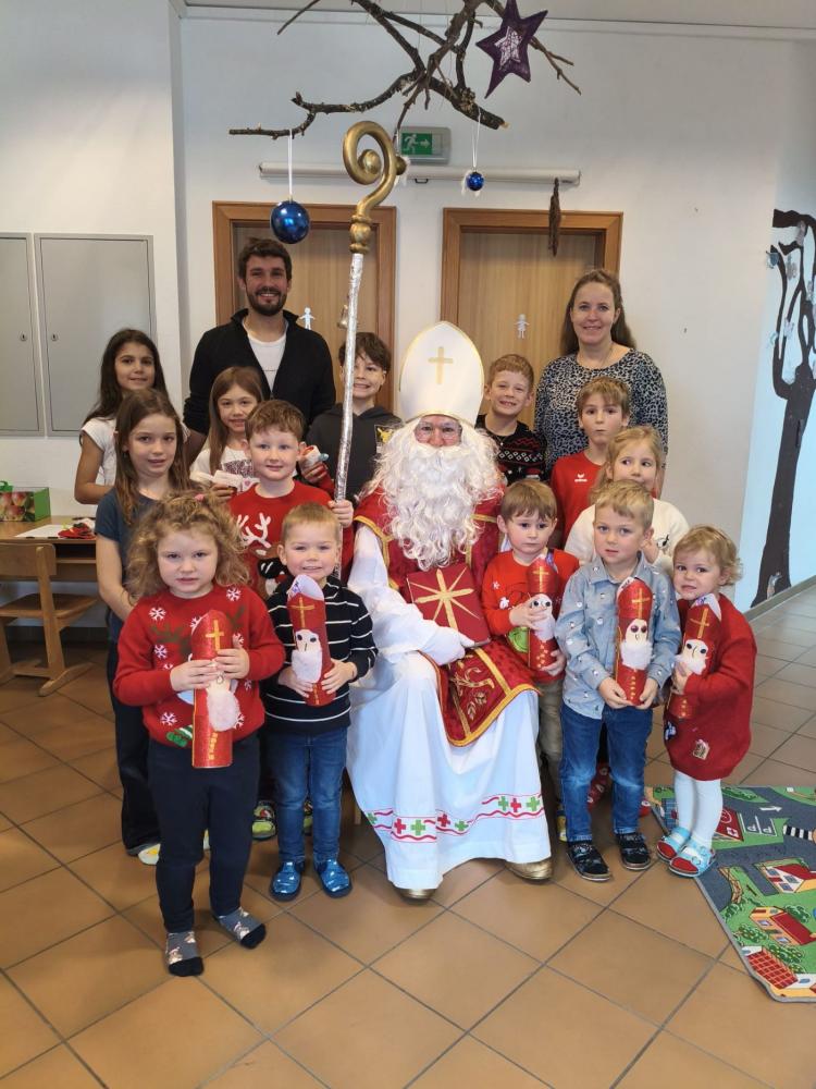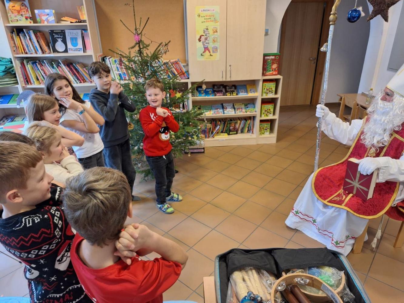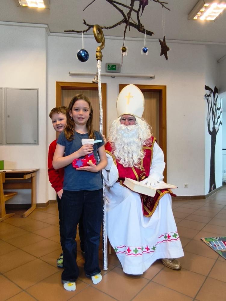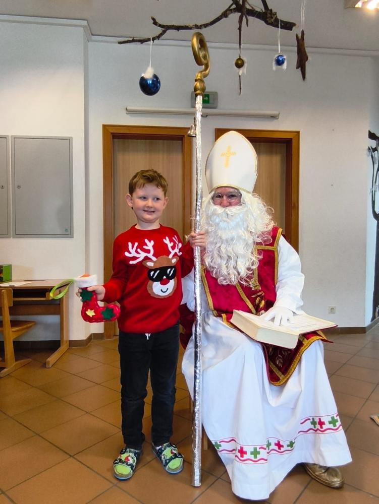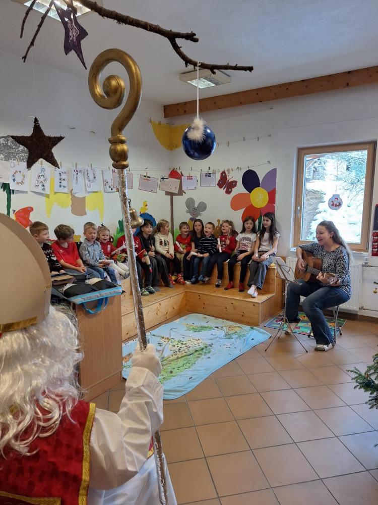 Am Freitag, den 05.12.2025, besuchte uns der Heilige Nikolaus in der Schule. Zusammen mit dem Kindergarten sangen wir für den Nikolaus Lieder und sagten ihm unsere gelernten Gedichte auf.